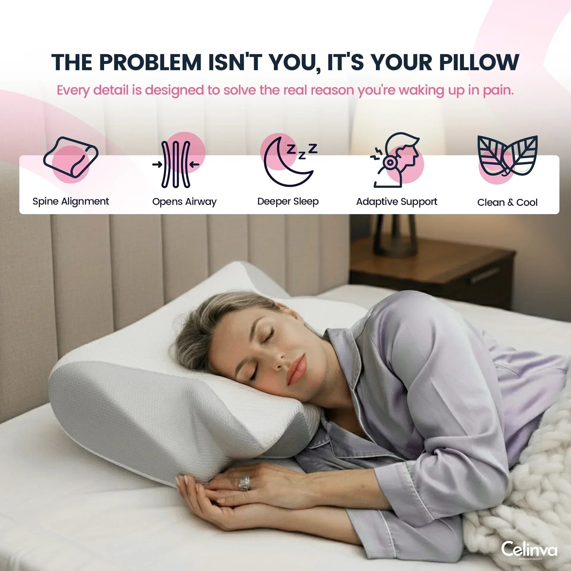Poor posture at night can restrict blood flow. CELINVA™ encourages natural alignment — easing tension so you wake up clearer, lighter, and headache-free.
