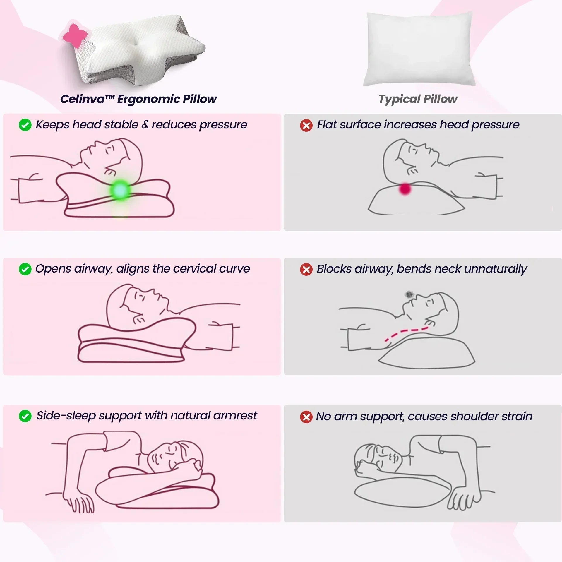 Crafted with a butterfly-contour design, CELINVA™ Ergonomic Sleep Pillow cradles your neck’s natural curve, easing tension before it becomes pain.